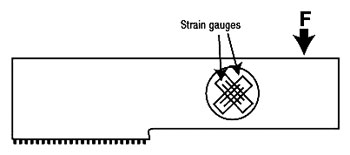 应变片是锯齿形条状导体,用金属薄膜蚀刻而成。原理是当受到机械应力时,导体电阻增大(该机械应力由薄膜长度和横截面上的微小变化而产生)。由此产生的电压变化很小,必须用惠斯通电桥或其他类似放大电路才能精确测量。图1中的字母F显示力如何传递到剪切梁传感器。